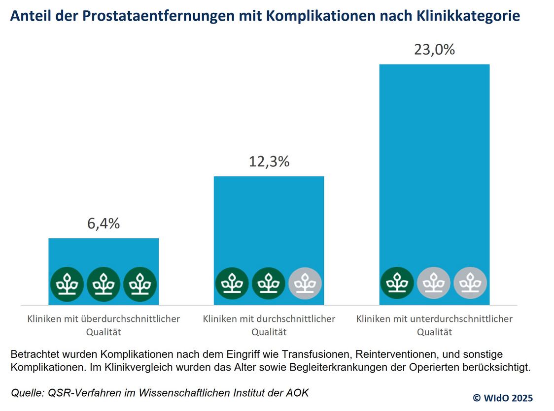 Patienten, bei denen eine Prostatakrebs-Operation ansteht, können durch die Wahl eines Krankenhauses mit guten Qualitätsergebnissen das Risiko für Komplikationen deutlich senken. Das zeigt eine aktuelle Analyse des WIdO im Verfahren Qualitätssicherung mit Routinedaten (QSR). Die Ergebnisse der einzelnen Kliniken sind im Gesundheitsnavigator der AOK abrufbar. Das WIdO hat rund 17.600 Fälle von AOK-Versicherten mit einer vollständigen Entfernung der Prostata wegen Prostatakrebs in den Jahren 2021 bis 2023 ausgewertet. Bei 12,7 Prozent der Fälle trat eine Komplikation während des OP-Aufenthalts oder im Jahr danach auf. Im Fünftel der Kliniken, die in der Auswertung überdurchschnittlich gut abgeschnitten haben, lag die Rate bei 6,4 Prozent, während im Fünftel der schlechtesten Kliniken fast ein Viertel der operierten Männer (23 Prozent) von Komplikationen betroffen war. Um einen fairen Klinikvergleich zu gewährleisten, wurden bei der Analyse im Rahmen einer Risikoadjustierung auch unterschiedliche Patienteneigenschaften wie Alter und Vorerkrankungen berücksichtigt. Die Detail-Bewertungen für 189 Kliniken, die im Auswertungszeitraum mindestens 30 Eingriffe bei AOK-Versicherten durchgeführt haben, sind seit heute im Gesundheitsnavigator der AOK (www.aok.de/gesundheitsnavigator) abrufbar. Ungeplante Folge-OP bei 6,8 Prozent aller FälleAusgewertet wurde unter anderem der Anteil der Patienten, bei denen innerhalb von 30 Tagen nach der Operation eine Bluttransfusion notwendig war, die auf starke Blutungen im Nachgang zur OP schließen lässt. Dies betraf 2,9 Prozent aller Patienten. Ebenfalls mit in die Bewertung eingeflossen ist der Anteil ungeplanter Folge-OPs im ersten Jahr nach der ersten Operation. Eine solche Folge-OP kann zum Beispiel zur Entfernung von angesammelter Lymphflüssigkeit als Folge der Prostatektomie erforderlich sein. Sie war bei einem relativ hohen Anteil von 6,8 Prozent der Operierten notwendig. Von sonstigen Komplikationen wie einer Sepsis, einem Schock oder akutem Nierenversagen im Zuge der Prostata-OP waren 5,6 Prozent der Patienten betroffen. 480 Komplikationsfälle wären vermeidbar gewesenEine zusätzliche Modellierung des WIdO zeigt: Wenn alle rund 3.200 Fälle, die in den unterdurchschnittlich bewerteten Krankenhäusern operiert wurden, in überdurchschnittlich abschneidenden Kliniken behandelt worden wären, hätten rund 480 Komplikationsfälle vermieden werden können. Dies macht deutlich, dass insbesondere bei planbaren Eingriffen eine transparente Darstellung von Qualitätsunterschieden dazu beitragen kann, Patientinnen und Patienten eine gute Wahl zu ermöglichen und unnötige Folgekosten zu vermeiden. DKG-Zertifizierung als wichtiges KriteriumDie Zertifizierung als Prostatakrebs-Zentrum durch die Deutsche Krebsgesellschaft ist ein weiteres wichtiges Kriterium für die betroffenen Patientinnen und Patienten bei der Wahl der Klinik. Die Studie zur „Wirksamkeit der Versorgung in onkologischen Zentren“ (WiZen) hat 2022 gezeigt, dass Patienten mit Krebs, die in DKG-zertifizierten Zentren behandelt werden, bessere Überlebenschancen haben. Diese Information wird auch im AOK-Navigator angezeigt. Insgesamt 34.7000 radikale Prostatektomien im Jahr 2024Die radikale Prostatektomie, also die vollständige Entfernung der Prostata, gehört zu den häufigsten Operationen bei älteren Männern. Sie kommt vor allem dann zur Anwendung, wenn der Krebs sich auf die Prostata beschränkt und das benachbarte Gewebe sowie Knochen oder andere Organe nicht befallen hat. Bei dem Eingriff wird die gesamte Prostata einschließlich der Samenblasen und der Endstücke der Samenleiter entfernt. Im Jahr 2024 sind in Deutschland insgesamt rund 34.700 radikale Prostatektomien durchgeführt worden. In den Analysen des WIdO werden ausschließlich Komplikationen der Operation bis zu einem Jahr abgebildet. Die Qualität der Harnblasenentleerung nach der Operation sowie eine mögliche Inkontinenz oder Impotenz kann das WIdO mangels verlässlicher Daten nicht auswerten. Die Ergebnisse sämtlicher an der Versorgung in Deutschland beteiligten Kliniken finden sich im Gesundheitsnavigator der AOK. Qualitätsergebnisse zu zwölf weiteren Behandlungen freigeschaltetNeben den Ergebnissen zur vollständigen Entfernung der Prostata wurden heute auch Qualitätsergebnisse für zwölf weitere Behandlungen freigeschaltet, die im Verfahren zur Qualitätssicherung mit Routinedaten (QSR) ausgewertet werden. Dies sind Operationen bei gutartiger Prostatavergrößerung, Hüftgelenks-Implantationen aufgrund von Arthrose, Operationen nach einem hüftgelenksnahen Oberschenkelbruch, Hüftprothesenwechsel, Implantationen eines künstlichen Kniegelenkes, Knieprothesenwechsel, Gallenblasenentfernungen bei Gallensteinen, Blinddarmentfernungen, Mandeloperationen, Leistenbruch-OPs, therapeutische Herzkatheter (PCI) bei Patienten ohne Herzinfarkt sowie kathetergestützte Aortenklappen-Implantationen (TAVI). Die Qualitätsindikatoren wurden gemeinsam mit klinisch tätigen Fachärztinnen und Fachärzten entwickelt. Die Klinikergebnisse werden im AOK-Gesundheitsnavigator angezeigt, wenn Nutzerinnen und Nutzer im Navigator nach Informationen zu einer dieser Behandlungen suchen. zur Krankenhaussuche im Gesundheitsnavigator der AOK >> Informationen zum QSR-Verfahren >> zur Pressemitteilung >>